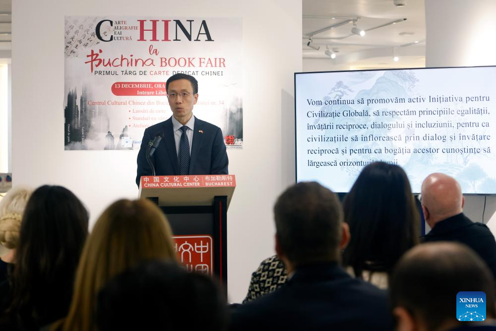 Chen Feng, Chinese ambassador to Romania, speaks during the opening ceremony of the 4th edition of the Buchina Book Fair at the China Cultural Center in Bucharest, Romania, Dec. 13, 2025. Buchina is a book fair dedicated to Chinese literature, culture and art. (Photo by Cristian Cristel/Xinhua)
