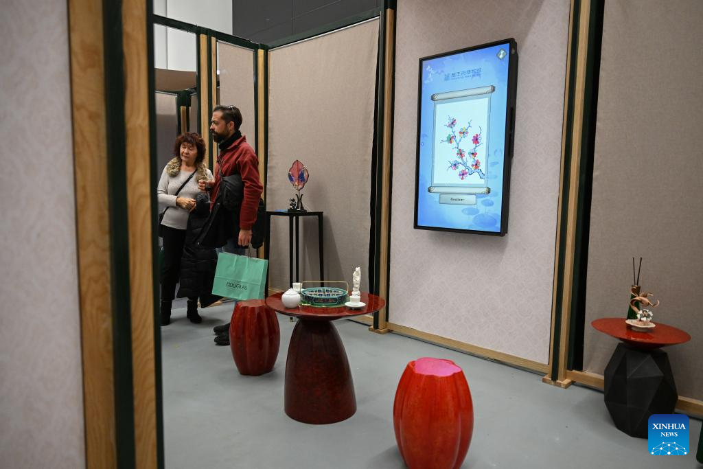 Visitors listen to an introduction on exhibits during an exhibition titled "Anshan Cuijin - an Exhibition of Chinese Life Aesthetics" at the China Cultural Center in Madrid, Spain, Dec. 16, 2025. The exhibition kicked off here on Tuesday and will run until March 2026, presenting the elegant charm of Chinese aesthetics. (Xinhua/Cheng Min)