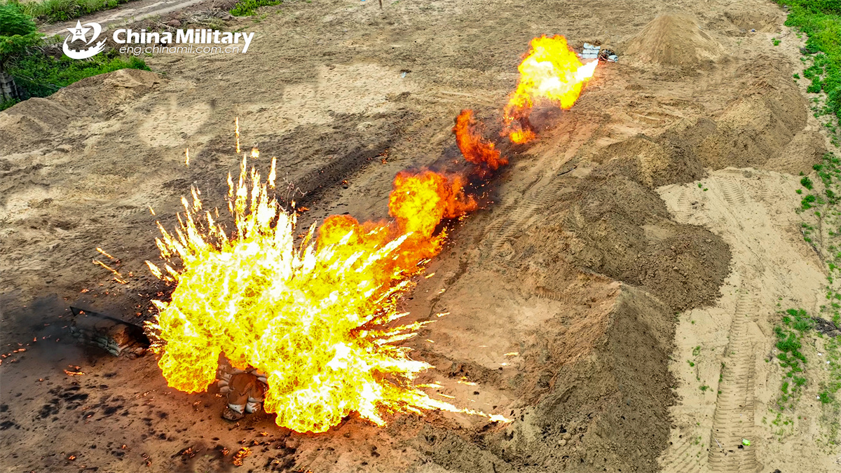 A flamethrower operator assigned to a chemical defense detachment of a brigade under the Chinese PLA Army ignites the controlled fire with a flamethrower against a fire-proof wall on December 6, 2025. (eng.chinamil.com.cn/Photo by Huang Weibo)